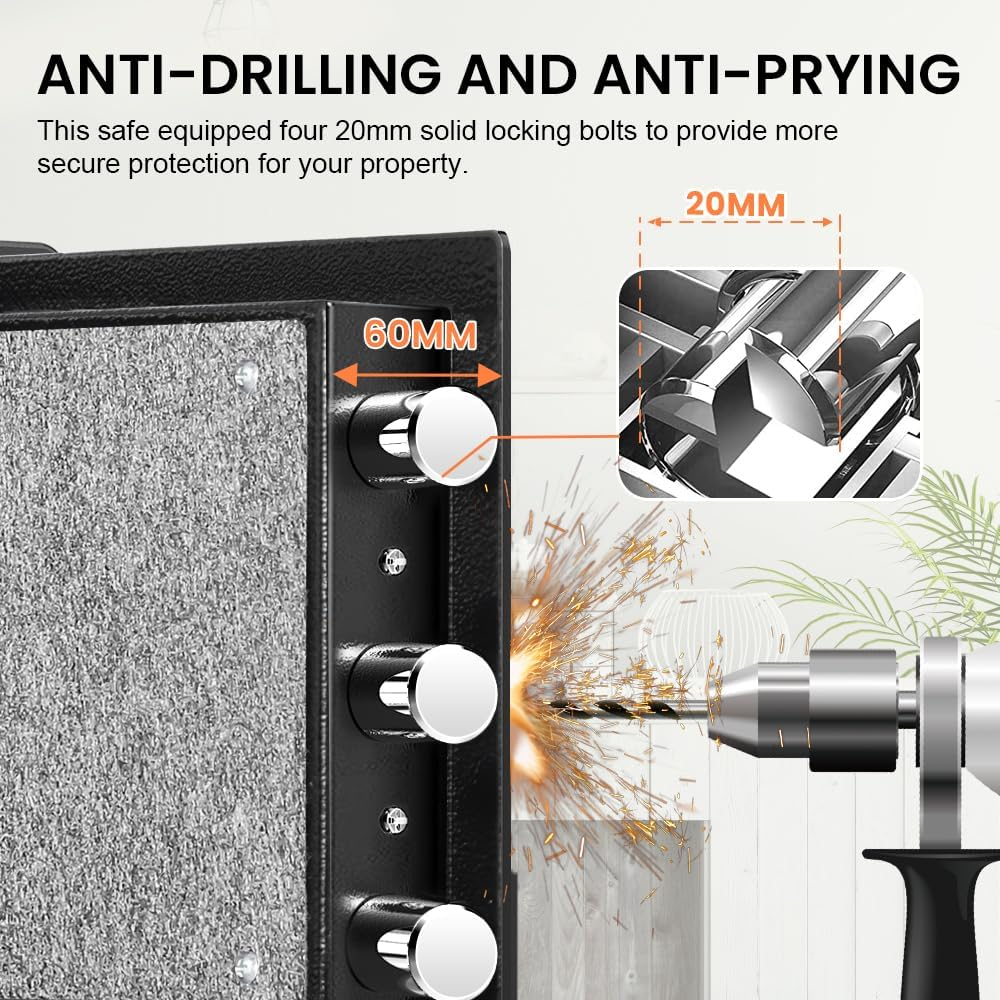 Product Introduction: Unlike Other Safes, the box and door panels of our safes are micro-slit designed with laser cutting precision, without any warping points, strengthening anti prying. The safe is made of high-quality solid cold rolled steel, which has excellent anti-drilling and high temperature resistance. The safe is equipped with 2 x 20MM solids locking bolts and 60MM thick solid door. Better protection for our property and privacy.