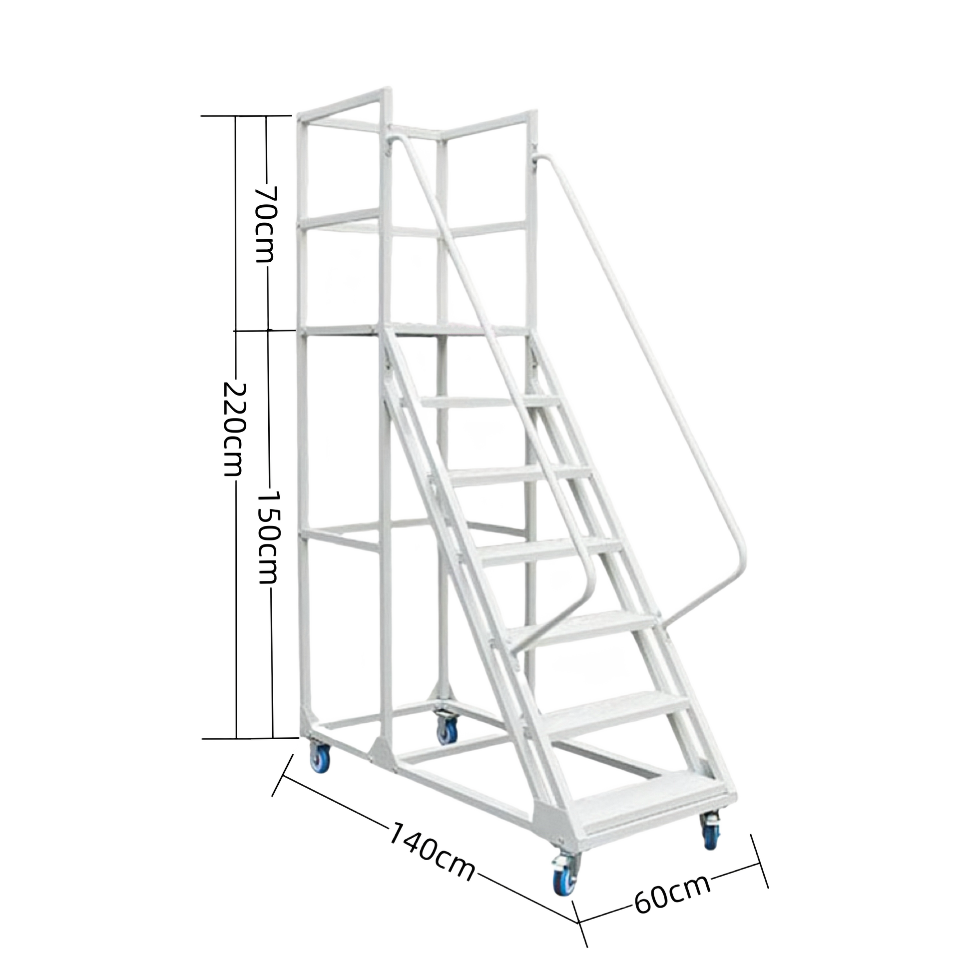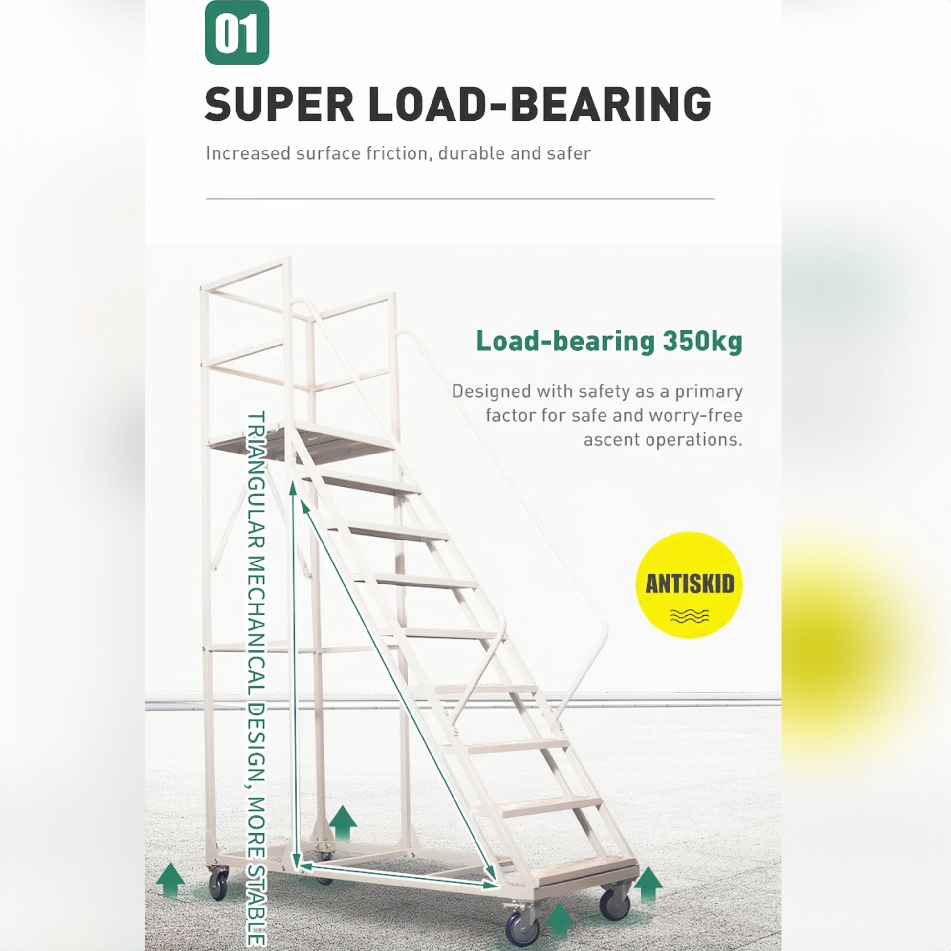 This steel mobile ladder one of the biggest characteristics of the ladder is can help the worker to catch up specific height. Easier to use With no front column in the way, faster to load and unload, lowering handling time and costs. Used commonly between racking & shelving.Practical, mobile safety steps with lockable castors and Non-silp steps that ensure your safety while marking the steps easy to move.