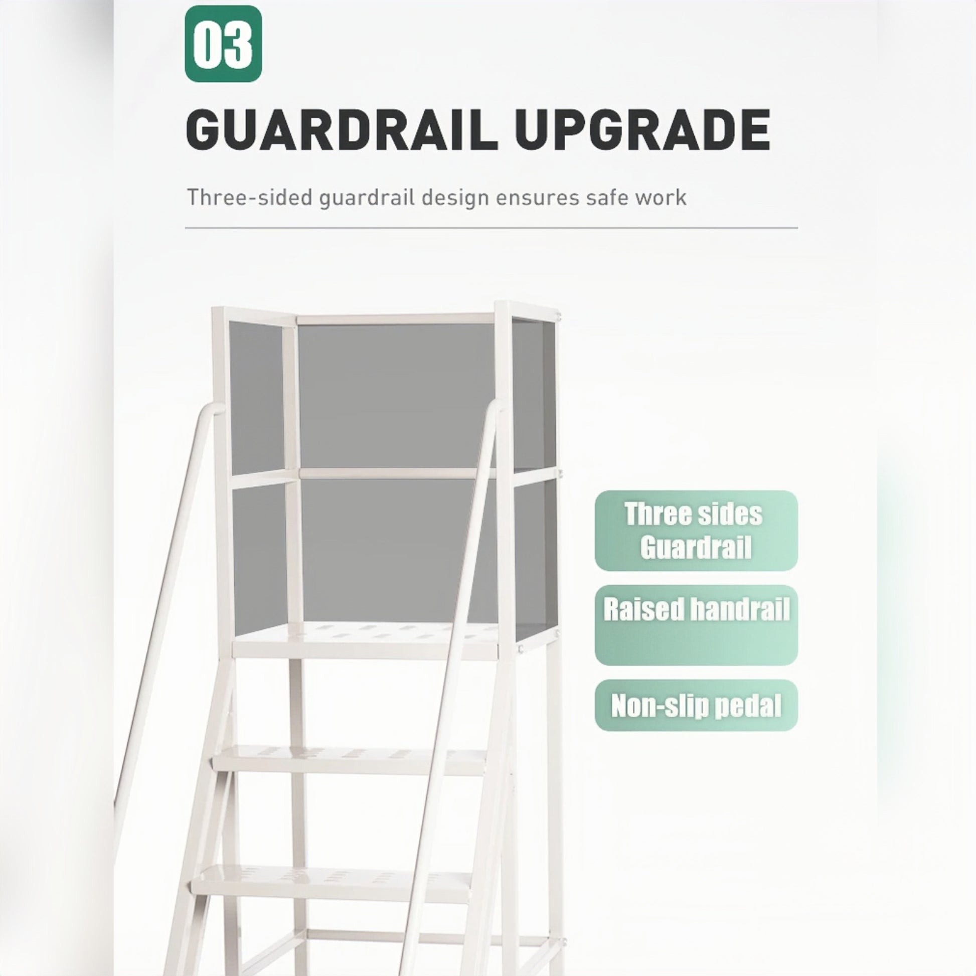 - Easy to move around: This 7 steps ladder comes with four built-in strong wheels (2 x 100mm swivel-brake and 2 x 100mm fixed castors). the industrial ladder will stay firmly in place when locking wheels. It's easy to move around and transport to different locations when unlocking.