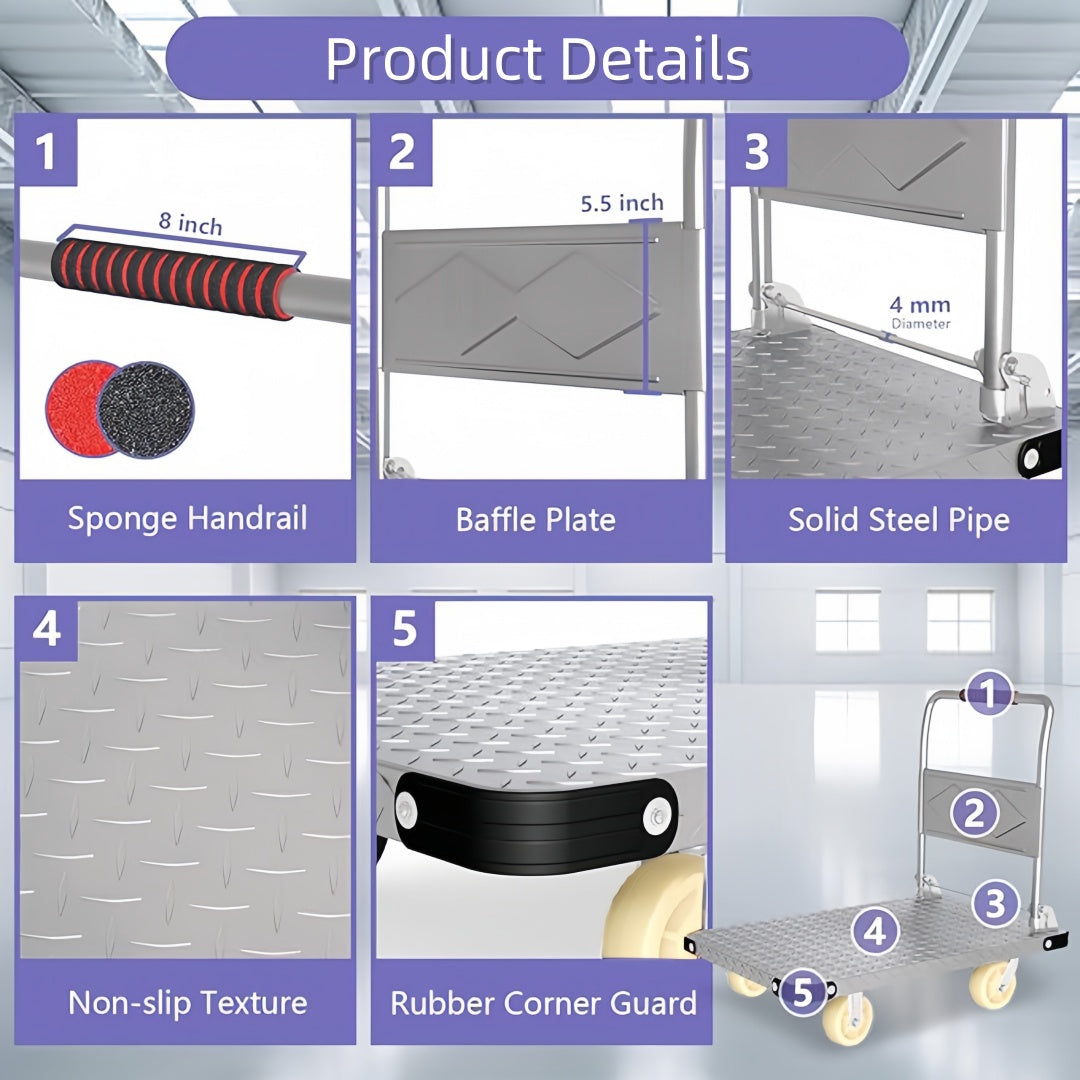- Robust Design This platform cart combines strength, durability, and convenience. Constructed from solid steel plate, it boasts weather resistance and anti-rust properties. The ergonomic sponge handle ensures a comfortable grip while minimizing the risk of slipping. Engineered for heavy-duty performance, this cart is perfect for any business or task.