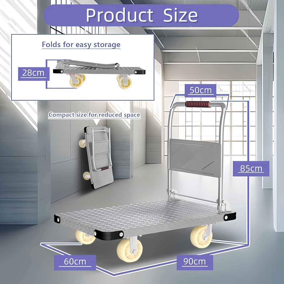 - Compact and Convenient Open size: W90*D60*H85cm. When not in use, the cart folds down to a compact size of W90*D60*H28cm. Simply fold the handle down in seconds, making storage hassle-free until your next job arises. Perfect for moving heavy items like groceries, furniture, appliances, and more around the home, garage, or warehouse.